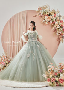 爽やかで清楚、春の光に映える透明感ドレス。甘さを抑えつつ、凛とした美しさを引き出します。